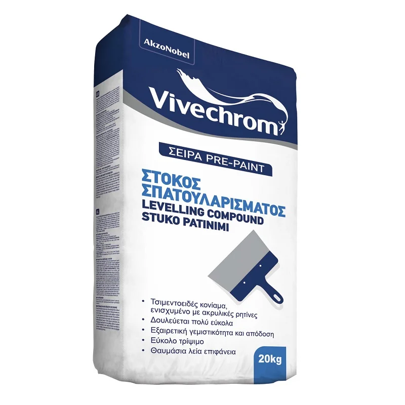 Ο Vivechrom ΣΤΟΚΟΣ ΣΠΑΤΟΥΛΑΡΙΣΜΑΤΟΣ είναι εξαιρετικά λεπτόκοκκος τσιμεντοειδής στόκος σε σκόνη, ενισχυμένος με ειδικές ακρυλικές ρητίνες. Χρησιμοποιείται για το στοκάρισμα, σπατουλάρισμα και την εξομάλυνση επιφανειών εσωτερικών και εξωτερικών χώρων πριν το βάψιμο (Σειρά PRE-PAINT). Είναι κατάλληλος για τοίχους και οροφές από σοβά, μπετόν, γυψοσανίδες, τούβλα και αντικαθιστά λαδόστοκους και παρόμοια υλικά. Με την προσθήκη νερού δημιουργείται μία ομοιογενής, κρεμώδης πάστα με πολύ καλή εργασιμότητα. Δουλεύεται μαλακά και εύκολα και έχει πολύ καλή γεμιστικότητα και απόδοση. Στεγνώνει γρήγορα, τρίβεται εύκολα, δε σκάει και δε συρρικνώνεται, δίνοντας μία θαυμάσια λευκή, λεία επιφάνεια. Με την προσθήκη βελτιωτικού κονιαμάτων VIVELATEX της Vivechrom στο ΣΤΟΚΟ ΣΠΑΤΟΥΛΑΡΙΣΜΑΤΟΣ ενισχύονται οι αντοχές του για εξωτερική χρήση.
